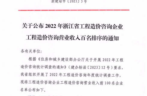 喜報 | 浙江華夏成功入圍2022年度浙江省工程造價咨詢營業(yè)收入百強企業(yè)