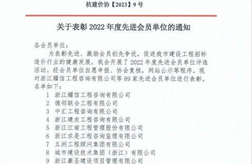 喜報 | 浙江華夏榮獲“杭州市建設(shè)工程造價管理協(xié)會2022年度先進(jìn)會員單位”